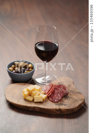olives, salami and vintage cheese with glass of red wine on walnut table