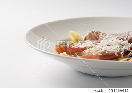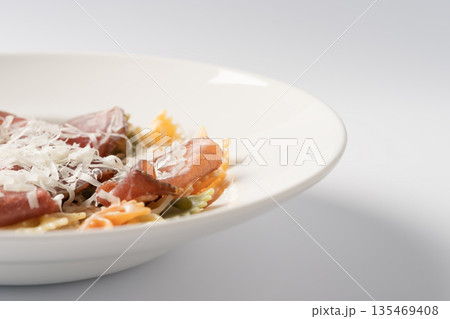 Pasta tagliatelle with chicken, pest and almonds in white bowl