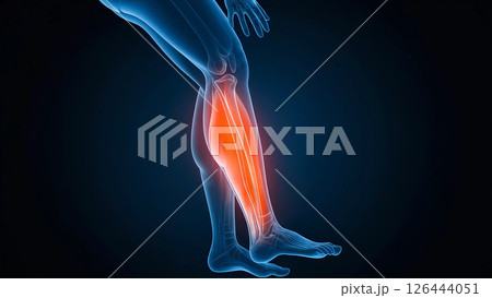 男性の、膝下の痛みや筋肉の緊張を表現した医学的イラスト。人体の筋肉構造を示し、炎症や負傷を強調