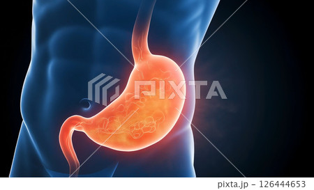 男性の、胃の痛みを表現した医学的イラスト。炎症や負傷を強調する3DCG