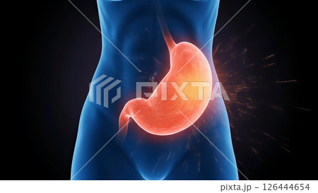 女性の、胃の痛みを表現した医学的イラスト。炎症や負傷を強調する3DCG