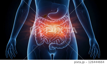 男性の、腸の痛みを表現した医学的イラスト。炎症や負傷を強調する3DCG映像