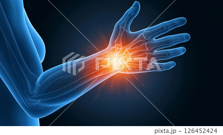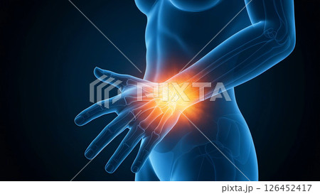 女性の、手首の痛みや筋肉の緊張を表現した医学的イラスト。人体の筋肉構造を示し、炎症や負傷を強調