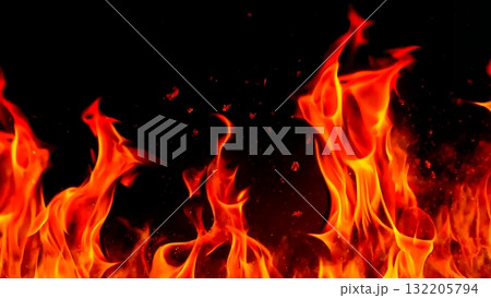 暗闇に燃え上がる赤とオレンジの炎。激しい炎と火花の背景
