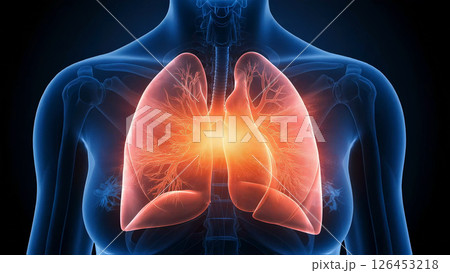 女性の、肺の痛みを表現した医学的イラスト。炎症や負傷を強調する3DCG画像