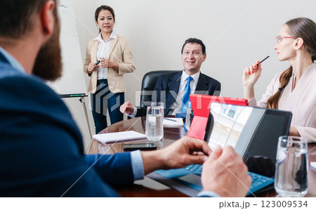 Business consultant listening to manager of corporation during meeting