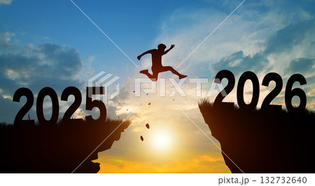 Happy new year in 2026. Man jumping across the gap from 2025 to 2026 cliff with Sunset and Twilight Sky background.