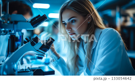 A scientist woman working hard to learn new things in a science lab. Exploring and finding out cool stuff using science tools. Generative AI.
