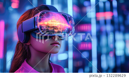 A girl wearing VR glasses interacts with a holographic globe. The concept of immersive learning, future technology, and global exploration through virtual reality. Generative AI.