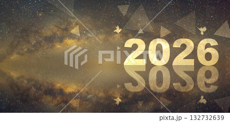 Panoramic horizontal design of Happy New Year 2026 with Firework and Milky way background.