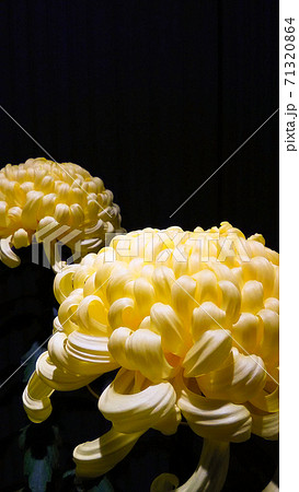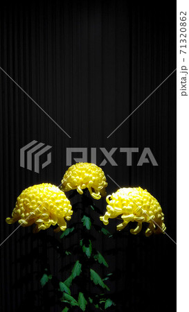 凛とした佇まいの菊の花(富士の輝き、三本立盆養菊作り、大輪、黄色、黒背景、タイトルスペース、縦位置)