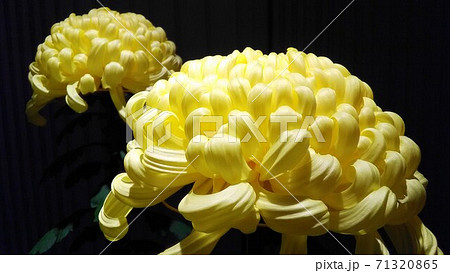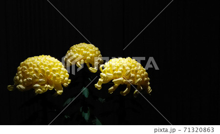 凛とした佇まいの菊(富士の輝き、大輪、黄色、菊の花、三本立盆養菊作り、黒背景、横位置、寄り)