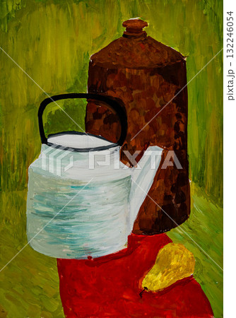 Still life painting featuring a kettle, a brown bottle, and a pear