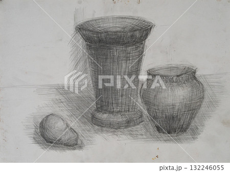 Black and white pencil drawing of pottery and an egg on a flat surface