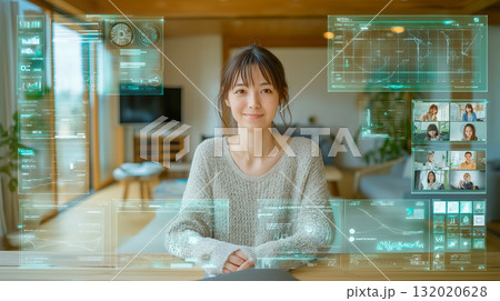 未来的なデジタルインターフェースでオンライン会議に参加する女性