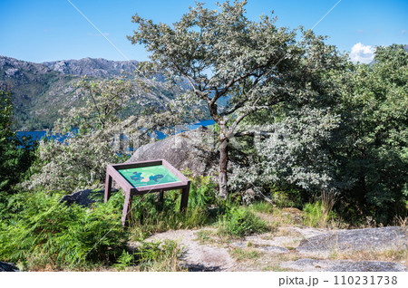 Sign near view point in Peneda Geres National Park, North Portugal, view of the mountains, rivers and trees, selective focus