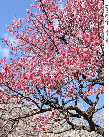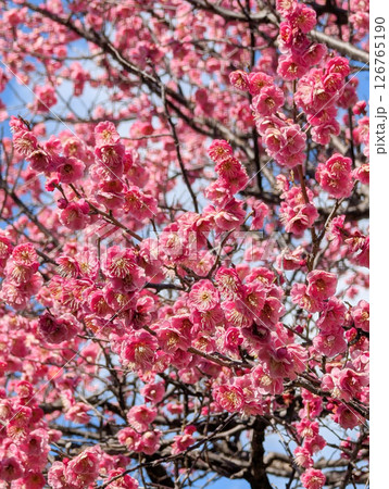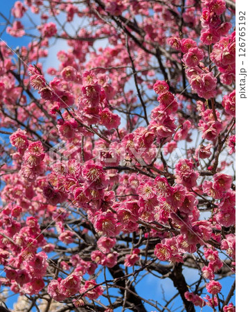 青空に映える満開の紅梅の花