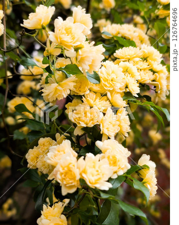 モッコウバラの黄色い花が咲く春の風景