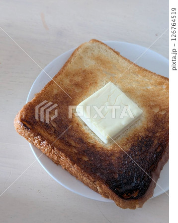 焦げたトーストにバターをのせた朝食