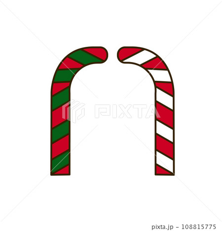 Set of two candy cane cartoon illustrations in red, green, and white. Christmas decorative element isolated background. Design is a simple flat vector clip art.
