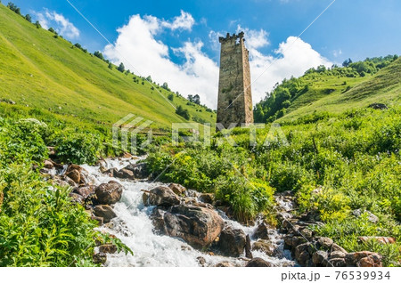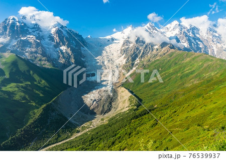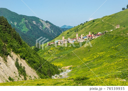 Beautiful grassy valley and snow-capped mountains in Georgia