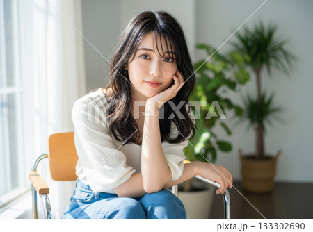 窓からの光が差し込む部屋で頬杖をついて穏やかに微笑む女性