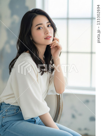 窓からの光を受けて椅子に座り思慮深い眼差しを向けるナチュラルな女性