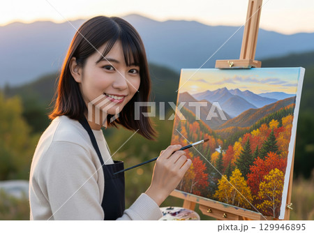 芸術の秋、夕暮れの山で油絵を描く日本人女性
