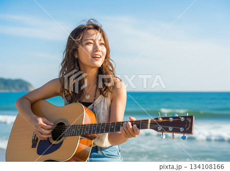 晴れた青空の下、満面の笑顔でギターをかき鳴らす、明るい表情の女性