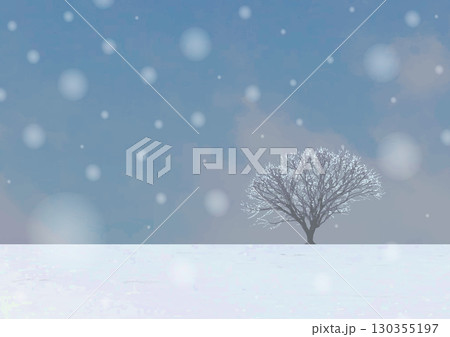 雪の降る真冬の夕暮れ時にひっそりと佇む美しい木のイメージイラスト