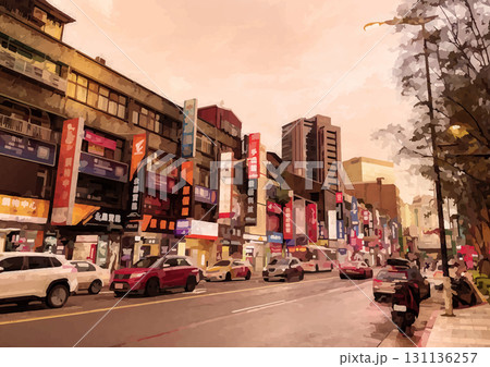 台北の大通り沿い_看板が並ぶ都会の夕暮れ
