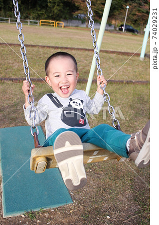 公園のすべり台で遊ぶ日本の男の子(三才児)