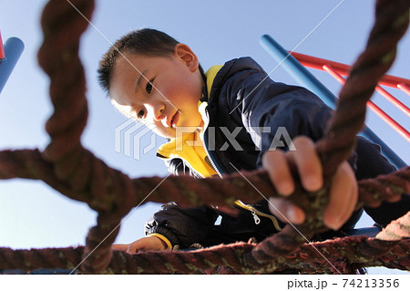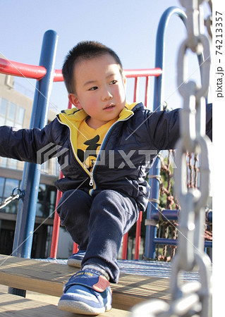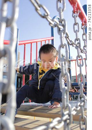 公園のアスレチック遊具で遊ぶ日本の男の子(三才児)