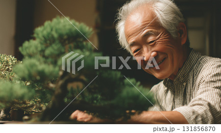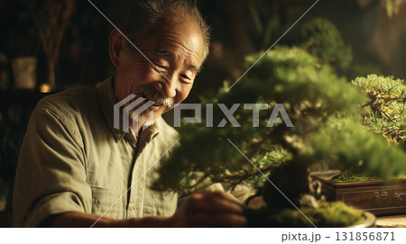 kind faced elderly man enjoys working with bonsai trees, showcasing his passion for gardening and nature. His smile reflects joy and dedication to this art form