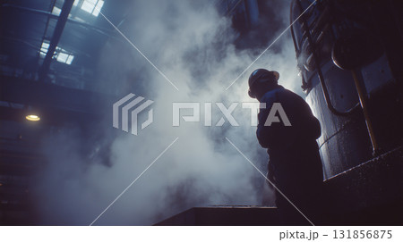 worker in heavy safety gear stands in smoky industrial environment, surrounded by steam and machinery, reflecting intensity of industrial labor