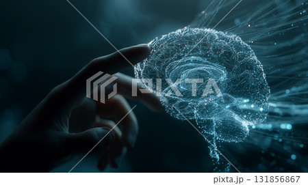 human hand gently touches digital brain, symbolizing connection between technology and human intelligence. scene is illuminated with blue glow, creating futuristic atmosphere