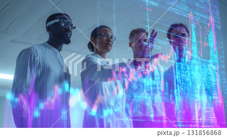 Diverse group of four professionals analyzing data on digital screen in modern office. They are engaged and focused, showcasing teamwork and collaboration in tech driven environment