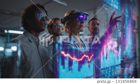 diverse group of four professionals wearing augmented reality glasses interact with digital data in modern office environment, showcasing innovation and teamwork