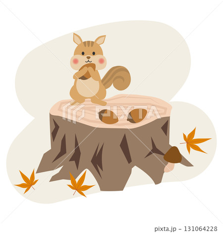 切り株に座るかわいいリスとどんぐりの秋イラスト