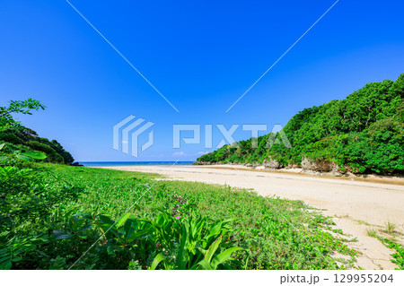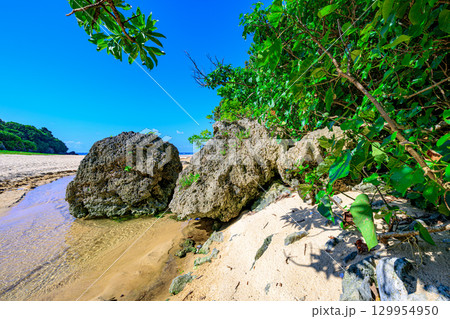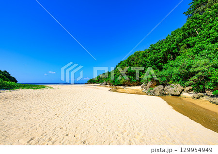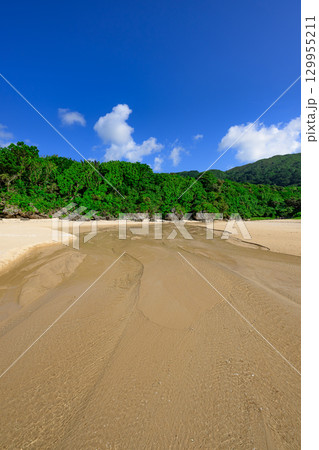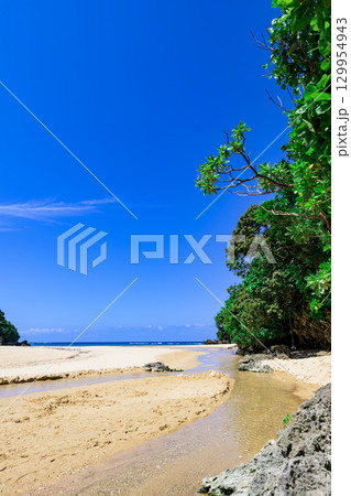 小川が流れる白砂の石垣島クリスタルビーチの夏の風景