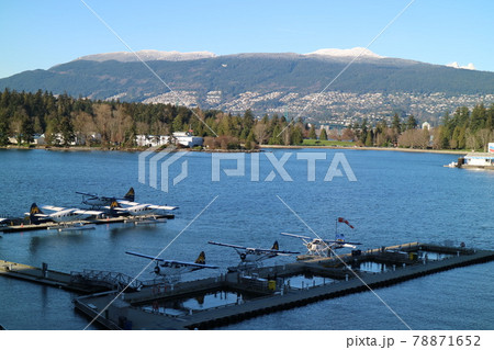 カナダの水上飛行機と雪山の景色