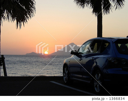 大隈半島から見た開聞岳と夕日と車