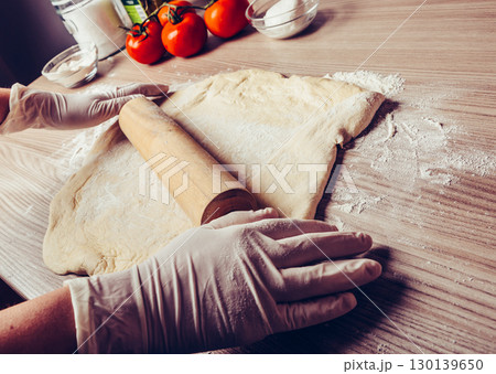 Baker kneading fresh pasta dough with rolling pin surrounded by ripe tomatoes and kitchen bowls on rustic wooden counter