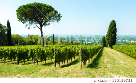 Italian vineyard rows stretch toward Mediterranean pine trees under brilliant summer sky