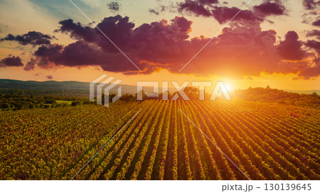 Breathtaking vineyard rows stretching toward brilliant sunset over rolling countryside hills