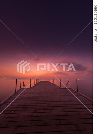 Wooden Pier Stretching Into Calm Waters Under Vibrant Purple Orange Twilight Sky