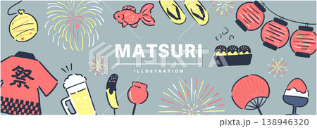 水色背景に祭り屋台の食べ物と小物を大きく配置した明るくポップな夏祭りの横長手描き風バナーイラスト