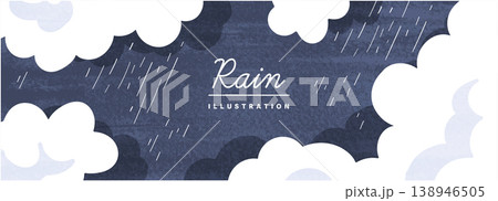 白い雲が囲む濃紺の雨空と斜めに降る雨線を描いたテクスチャ入り横長レイン背景イラスト
