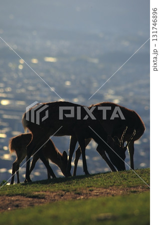 夕陽に染まるシカの群れ