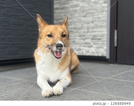 玄関前でくつろぐ愛犬